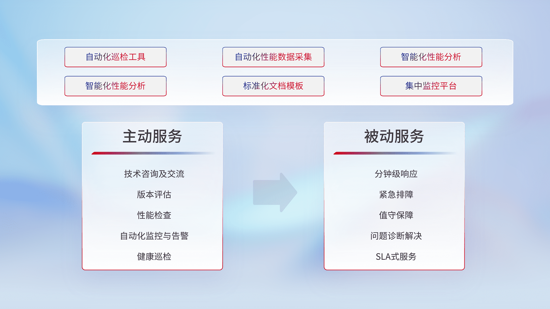 智能化工具和标准化文档,,,,保障服务质量,,,,提供主动服务(包含技术咨询、、版本评估、、、、性能检查、、、自动化监控与告警、、、、健康巡检)和被动服务包含(分钟级响应、、、紧急排障、、值守保障、、、、问题诊断解决、、SLA服务)。。